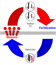Reproducerea sexuală la eucariote este un proces prin care organismele produc urmași care combină trăsăturile genetice ale ambilor părinți. Cromozomii sunt transmiși de la o generație la alta în acest proces. Fiecare celulă din urmași are jumătate din cromozomi de la mamă și jumătate de la tată.[15] Trăsăturile genetice sunt conținute în acidul dezoxiribonucleic (ADN) al cromozomilor - prin combinarea unuia dintre fiecare tip de cromozomi de la fiecare părinte, se formează un organism care conține un set dublat de cromozomi. Această etapă cu dublu cromozom este denumită „diploid”, în timp ce stadiul cu un singur cromozom este „haploid”. Organismele diploide, la rândul lor, pot forma celule haploide (gameți) care conțin la întâmplare una dintre fiecare perechi de cromozomi, prin meioză.[16] Meioza implică, de asemenea, o etapă de încrucișare cromozomială, în care regiunile ADN sunt schimbate între tipurile de cromozomi potriviți, pentru a forma o nouă pereche de cromozomi combinați. Traversarea și fertilizarea (recombinarea seturilor unice de cromozomi pentru a face un nou diploid) rezultă în noul organism care conține un set diferit de trăsături genetice de la oricare dintre părinți.