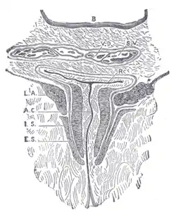 ![]() Secțiune coronală prin canalul anal B. Cavitatea vezicii urinare V. D. Canal deferent S. V. Veziculă seminală R. Rect A. C. Canal anal L. A. Mușchiul ridicător al anusului I. S. Sfincterul anal intern E. S. Sfincterul anal extern | |