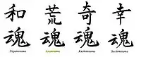 | Aramitama | Reprezentarea agresivității, forței, distrugerii[20], sursă de valoare, furie, pasiune și alte emoții vulcanice, puternice. Este considerata a fi cea mai vivace latură a naturii duale a sufletului. | Dacă Aramitama atinge un prag excesiv, se produce o stare agitată, iar fără relaxare, mintea și corpul ar fi erodate de stress și oboseală, conducând la o îmbolnăvire fizică și psihică. | Slăbirea acestui spirit are ca efect instaurarea unui sentiment al rușinii[21]. |