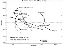 ![]() Suprapunere a trei imagini făcute de sonda spațială Cassini în 2013, arătând locația lui Siarnaq la intervale de zece minute[lower-alpha 1] | |