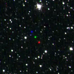 - Merger of three images, colored red, green, and blue respectively, to highlight Siarnaq as it moves relative to the background stars.