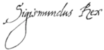 În latină: Sigismundus Tertius Dei gratia rex Poloniæ, magnus dux Lithuaniæ, Russiæ, Prussiæ, Masoviæ, Samogitiæ, Livoniæque, necnon Suecorum, Gothorum Vandalorumque hæreditarius rex.