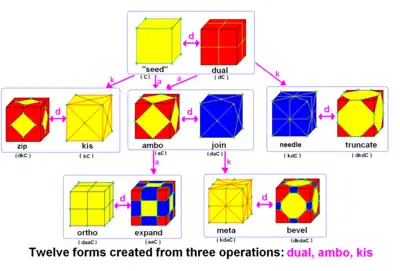 Conway și Hart au extins ideea utilizării operatorilor, așa cum trunchierea a fost definită de Kepler, pentru a construi poliedre înrudite cu aceeași simetrie. De exemplu, tC reprezintă un cub trunchiat, iar taC, înțeles ca , este (topologic) un cuboctaedru trunchiat. Cel mai simplu operator, dualul, interschimbă elementele vârfuri cu fețe; de exemplu, un cub dual este un octaedru: dC = O. Aplicați consecutiv, acești operatori permit generarea multor poliedre de ordin superior. Conway a definit operatorii abdegjkmost, în timp ce Hart a adăugat r și p.[3] Implementările ulterioare au introdus și alți operatori, uneori denumiți operatori „extinși”.[4][5] Operatorii Conway de bază sunt suficienți pentru a genera poliedrele arhimedice și cele Catalan din poliedrele platonice. Unele operații de bază pot fi realizate prin compunerea altora: de exemplu, ambo aplicat de două ori este operația de extindere: aa = e, în timp ce o trunchiere după ambo produce bont: ta =b.