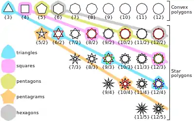poligoanele stelate regulate nu sunt convexe, iar simbolurile lor Schläfli {p/q} conțin [fracție ireductibilă |fracții ireductibile]] p/q, unde p este numărul de vârfuri, iar q este numărul de ocoliri împrejur al căii pentru a reveni într-un același vârf. Echivalent, {p/q} este dat de numărul de vârfuri {p}, conectate „din q în q”. De exemplu, {5⁄2} este o pentagramă; {5⁄1} este un pentagon.