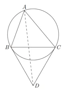 Fie ABC un triunghi. Se construiește punctul D ca intersecție a tangentelor în B și C la cercul circumscris triunghiului. Atunci AD este simediana triunghiului ABC.[7]
