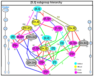 ) de ordinul 120 are generatorii reprezentați de matricile de reflexie R0, R1, R2 mai jos în relațiile R02 = R12 = R22 = (R0×R1)5 = (R1×R2)3 = (R0×R2)2 = identitatea. Grupul [5,3]+ (![]()