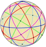 | Laturile unui compus de cinci octaedre sferic reprezintă cele 15 plane de oglindire ca cercuri mari colorate. Fiecare octaedru poate reprezenta 3 plane de oglindire ortogonale care conțin laturile sale. | |