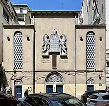 Relief cu cele Zece Porunci flancate de leii Iudeii de pe fațada sinagogii