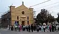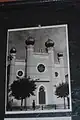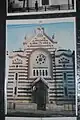 Membrii echipei de restaurare a sinagogii stând în picioare în fața edificiului