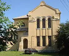 Faţada vestică cu inscripţii în ebraică deasupra intrării principale în sinagogă