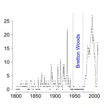 La 15 august 1971, Statele Unite au încetat unilateral convertibilitatea dolarului american în aur, punând efectiv stop sistemul Bretton Woods și transformând dolarul într-o monedă fiduciară.[2] În același timp, multe monede fixe (cum ar fi lira sterlină) au devenit de asemenea fluctuante.
