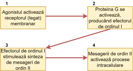 Efectorul primar întreprinde apoi o acțiune, care creează un semnal (de exemplu, o moleculă) difuzabil în interiorul celulei. Acest semnal este numit mesager de ordin II (sau mesager secundar). Mesagerul secundar poate activa apoi un „efector secundar”, ale cărui efecte depind de propriul sistem de mesagerie.