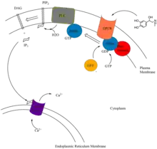 Legarea mesagerului de ordin I la unul dintre acești receptori are ca rezultat schimbarea conformațională a receptorului. Subunitatea α, cu ajutorul factorilor de schimb ai nucleotidelor de guanină (GEFS), eliberează GDP și leagă GTP, rezultând disocierea și activarea subunității. [9] Subunitatea α activată activează fosfolipaza C, care hidrolizează PIP2 (fosfatidilinozitolul 4,5-bifosfat), rezultând formarea mesagerilor de ordin II: diacilglicerolul (DAG) și inozitolul-1,4,5-trifosfat (IP3). [10] IP3 se leagă de pompele de calciu de pe reticulul endoplasmatic, aducând Ca2+ (un alt mesager de ordin II) în citoplasmă. [11] [12] Ca2+ se leagă în cele din urmă de multe proteine, activând o cascadă de căi enzimatice.