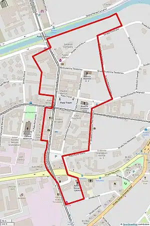 | Adresa | Mărginit de: • Str. Timocului, • Str. Dacilor (ambele fronturi), • Str. Ștefan cel Mare (ambele fronturi), • Str. Școlii, • Str. Comănești – Piața Mitropolit Alexandru Șuluțiu Sterca, • Piața Aurel Vlaicu, • Str. Constantin Titel Petrescu, • Str. Costache Negruzzi, • Str. Petre Ispirescu |