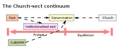 În sociologia religiilor, grupurile religioase sunt clasificate ca biserici, confesiuni, secte sau culte (acum mai frecvent denumite în studii ca noi mișcări religioase). [19] Tipologia biserică-sectă își are originile în opera lui Max Weber. Există un continuum al unei premise de bază de-a lungul căruia se încadrează religiile, variind de la sectele orientate spre protest până la biserici care mențin echilibrul. Acest continuum include mai multe tipuri suplimentare. Sociologii dau acestor cuvinte definiții precise care diferă de modul în care sunt utilizate în mod obișnuit. Aceștia folosesc cuvintele „cult” și „sectă” fără conotații negative, chiar dacă utilizarea populară a acestor cuvinte este adesea peiorativă. [20]