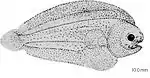 Au un corp oval și alungit în formă de frunză sau limbă, puternic comprimat lateral (care în stare matură e asimetric). Capul este nediferențiat de trunchi, cu botul rotunjit, în formă de un lob cărnos. Maxila proeminează mult în afara mandibulei. Gura mică, inferioară, puternic curbată, cu dinți foarte mici, catifelați, abia vizibili, sau lipsită complet de dinți.