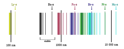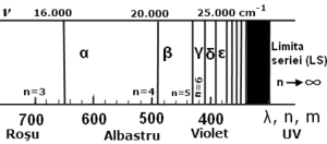 Aceste linii sunt urmate de altele cu lungimi de undă tot mai mici decât ale celor precedente, sunt din ce în ce mai apropiate între ele, din ce în ce mai puțin intense și mai greu observabile, spectrul de linii transformându-se într-un spectru continuu. Valorile acestor lungimi de undă, mai exact ale numerelor de undă corespunzătoare, rezultă din relația dedusă empiric de către Johann Jakob Balmer în 1885: