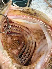 Fiecare arc branhial poartă pe partea convexă un număr variabil, după specie, de foițe branhiale, iar pe partea concavă, la cei mai mulți pești, două rânduri de spini branhiali sau dinți filtratori de formă și număr variabil, care alcătuiesc un fel de sită (filtru), datorită întrepătrunderii șirului din față al spinilor branhiali cu șirul din spate al arcului alăturat. Acest filtru format de spinii branhiali pe de o parte, apără branhiile de pătrunderea în cavitatea branhială a corpurilor străine care intră în cavitatea bucală odată cu apa, iar pe de altă parte, rețin animale mici și planctonul, ce servesc drept hrană peștelui.