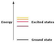 Nivelele de energie pentru un electron al unui atom: starea fundamentală și starea excitată. După absorbția de energie, un electron poate să treacă de un nivel de energie la următorul, pornind de la starea fundamentală și ajungând la stările de excitație.[1]