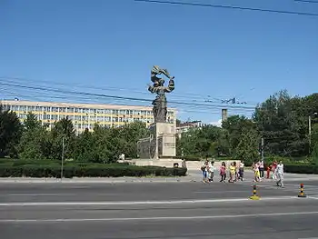 Statuia Independenței (în faţă) și Policlinica Municipală (în spate)