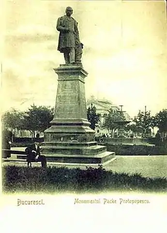 Statuia lui Emanoil Pake-Protopopescu a fost realizată în anul 1903 din marmură albă de Carrara de către sculptorul Ion Georgescu și a fost demolată în anul 1948 de autoritățile comuniste.