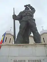 Pe un soclu masiv, de forma unei prisme cu baza pătrată, este amplasată statuia unui infanterist, care are în mâna stângă o pușcă, iar în mâna dreaptă o ramură de stejar. Pe placa de marmură albă fixată pe soclu este scris: „Glorie eternă eroilor armatei române"[2].