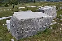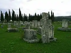 - Mormântul lui Vlatko Vuković Kosača(d) este marcat lângă satul Boljuni de lângă Stolac(d), în Bosnia și Herțegovina, datând de la sfârșitul secolului al XIV-lea. Inscripția de pe mormânt a fost scrisă în alfabetul chirilic bosniac(d) cu accent ikavian(d).[122]