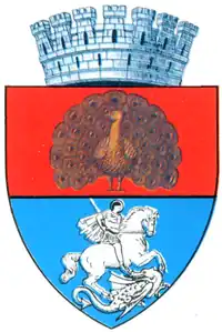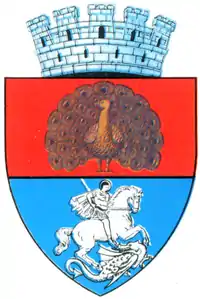 Scutulîn câmp argintiu, se afla Crucea Sfântului Gheorghe, de culoare roșie, în câmp roșu, se află un păun de aur, conturnat, cu coada desfacută.