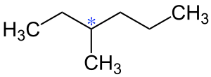 Exemplu de stereocentru (marcat cu un asterisc albastru) în molecula de 3-metilhexan. În acest caz, avem un atom de carbon asimetric, care leagă trei grupe alchil diferite (etil, n-propil și metil) și un atom de hidrogen.