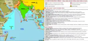 China urmărește să izoleze India[6] (marele său rival economic) la nivel regional prin crearea de alianțe cu țările vecine, cum ar fi Pakistan, Bangladesh, Birmania sau Sri Lanka. Tensiunile dintre cele două țări rămân ridicate după războiul chino-indian din 1962 în Himalaya (câștigat de China): cele două țări nu au ajuns încă la un acord asupra unor anumite chestiuni teritoriale.