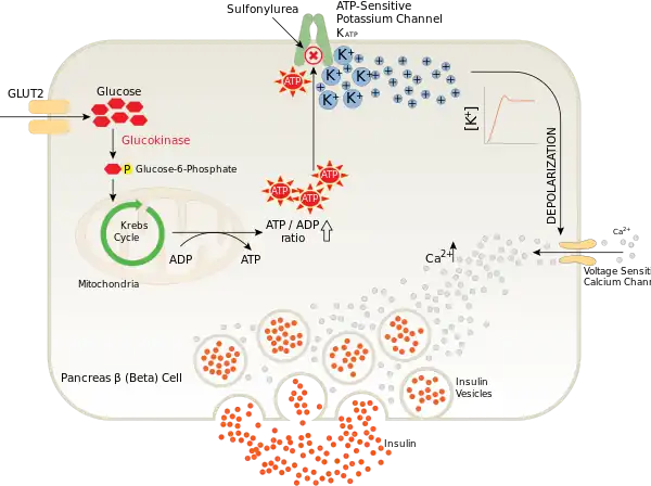 Toți derivații de sulfoniluree se leagă și închid canalele ionice de K+, cu scăderea efluxului de potasiu din celulă. Depolarizarea duce la deschiderea canalelor de Ca2+ voltaj-dependente și creșterea nivelelor intracelulare de calciu, ceea ce va duce la creșterea secreției celulare de insulină și eliberarea acesteia în afara celulei.[6]
