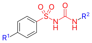 ![]() Structura generală a unui derivat de sulfoniluree | |