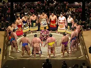 Arbitrul este numit gyōji, care este îmbrăcat în costum purtat de nobilii de la Curtea Imperială în secolul al XIV-lea.[6]