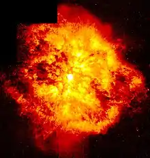 O supernovă este o explozie stelară mai puternică decât o novă. Supernovele sunt extrem de luminoase și cauzează o explozie de radiații care adesea este mai strălucitoare decât o întreagă galaxie, înainte de a dispărea după câteva săptămâni sau luni. De-a lungul acestui interval, o supernovă poate radia tot atâta energie cât ar putea emite Soarele pe toată durata sa de viață.[1] Explozia elimină mare parte sau tot materialul unei stele[2] cu o viteză de până la 30.000 km/s (o zecime din viteza luminii), declanșând propagarea unei unde de șoc[3] în mediul interstelar înconjurător. Unda de șoc duce la răspândirea unui nor de gaz și praf denumit rămășiță de supernovă.