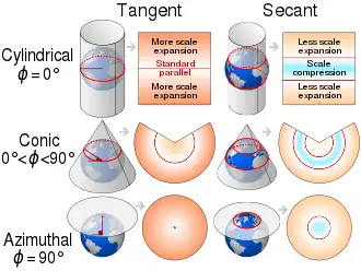 Multe proiecții cartografice proiectează Pământul pe o suprafață desfășurabilă, care apoi este desfășurată, devenind o hartă.