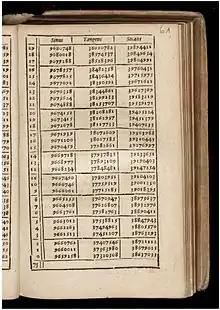 Tabelele trigonometrice sunt tabele matematice care conțin valori calculate ale funcțiilor trigonometrice. Înainte de existența calculatoarelor de buzunar, aceste tabele erau esențiale pentru navigație, știință și inginerie. Calculul acestor tabele a fost un domeniu important de studiu, care a condus la dezvoltarea primelor dispozitive de calcul mecanice.