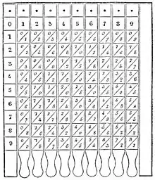 În cartea sa din 1820 The Philosophy of Arithmetic, matematicianul John Leslie a publicat o tablă a înmulțirii până la 99 × 99, care permitea înmulțiri de câte două cifre deodată. Leslie a recomandat ca tinerii să memoreze tabla înmulțirii până la 50 × 50.[7]