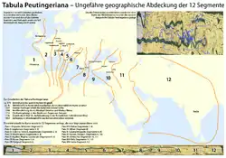Cele douăsprezece segmente ale Tabulei Peutingeriana sunt, în ordine, de la Vest spre Est, următoarele: