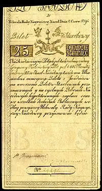 Până în iunie, prusacii începuseră să-i ajute activ pe ruși, iar pe , Kościuszko a ajuns să ducă o luptă defensivă împotriva unei forțe ruso-prusace la Szczekociny(d).[100] De la sfârșitul lunii iunie, timp de câteva săptămâni, a apărat Varșovia(d), controlată de insurgenți. La , o mulțime de insurgenți din Varșovia l-au capturat și spânzurat pe episcopul Ignacy Massalski(d) și pe alți șase oameni. Kościuszko a emis un reproș public, scriind: „ceea ce s-a întâmplat ieri la Varșovia mi-a umplut inima de amărăciune și durere”, și a cerut ca statul de drept să fie respectat, ceea ce i s-a promis.[102] Până în dimineața zilei de , forțele prusace au fost retrase pentru a suprima o răscoală în curs de desfășurare în Polonia Mare, asediul Varșoviei a fost ridicat. Pe , în timpul unei ieșiri în fața unui nou atac rusesc, Kościuszko a fost rănit și luat prizonier la Maciejowice(d). A fost încarcerat de ruși la Sankt Petersburg în Cetatea Petru și Pavel.[103] Curând după aceea, răscoala s-a încheiat cu bătălia de la Praga(d), unde, potrivit unui martor rus contemporan, trupele rusești au masacrat 20.000 de locuitori din Varșovia.[104] A urmat a treia împărțire a Poloniei(d), care a pus capăt existenței unui stat suveran polono-lituanian pentru următorii 123 de ani.[105]