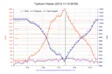 Datele Agenției Meteorologice Japoneze arată că viteza vântului (pe o perioadă susținută de cel puțin zece minute) a ajuns pe alocuri la 235 km/h, fiind astfel vorba de al doilea ciclon tropical ca intensitate din Oceanul Pacific de nord-vest, împreună cu Bess în 1982 și Megi în 2010, după Taifunul Tip din 1979.[1] Datele prezentate de Joint Typhoon Warning Center din SUA arată că Haiyan a fost cel mai intens ciclon tropical pe plan global în perioada istorică de când se înregistrează datele cicloanelor, cu un maxim (timp de un minut) de 315 km/h (195 mph).[2] Haiyan de asemenea a lovit țărmul la momentul de putere maximă, facându-l astfel probabil cel mai puternic ciclon tropical care a ajuns pe uscat.[3] Presiunea atmosferică estimată de către Agenția Meteorologică Japoneză a fost de 895 hPa (26.43 inHg), cea mai scăzută după Taifunul Megi din 2010.[4]