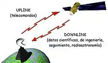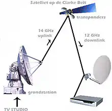 Semnalele transmisiilor de televiziunea prin satelit, se fac de la sol prin intermediul unei stații (uplink). Stațiile de sol folosesc emițătoare cu putere de cca 5-10 kW, antene parabolice de cca 20-25 m diametru și sunt dotate cu aparatura necesară de urmărire a evoluției sateliților. Antena de la sol este îndreptată spre un anumit satelit (downlink), iar semnalele sunt transmise într-un anumit interval de frecvențe, care sunt primite de către transponder-ul satelitului.