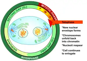 În stadiul final de mitoză - telofază - în jurul celor două seturi de fiice de cromozomi, care s-au dus la polii opuși ai celulei în stadiul de anafază, membrana nucleară începe să se formeze. La început, cromozomii își păstrează orientarea anafasică: centromerele se îndreaptă spre poli de celulă și telomerii spre centrul axului. Formarea plicului nuclear este precedată de dezasamblarea axului de divizare. Există o prelungire a microtubulilor astrali și se formează o nouă structură microtubule - un corp rezidual, care este situat între două seturi distincte de cromozomi. Depolimerizarea are loc în direcția de la polii de divizare până la planul ecuatorial al celulei, de la capetele minus la capetele plus. În același timp, microtubulii rămân în corpul rezidual cel mai mult timp. La asamblarea membranei nucleare, veziculele de membrană ale citoplasmei se leagă de suprafața cromozomilor individuali, apoi se îmbină între ele și înconjoară grupurile de cromozomi și apoi se îmbină pentru a forma membrana nucleară. Mai întâi, plicul nucleic se formează pe suprafețele laterale ale cromozomilor și, ulterior, pe centromere și telomeres. Mai mult, complexele de pori nucleare sunt încorporate în el, se formează o lamă nucleară, apare un nucleol și membrana nucleară este din nou conectată la reticulul endoplasmatic. Complexele cu pori nucleari încarcă proteinele nucleare în nucleu din citoplasmă, nucleul se extinde, iar decondenizarea cromozomilor, trecând în starea interfazică, începe transcripția genetică. Mitoza se completează cu formarea de nuclee fiice, iar citoplasma celulei rămâne doar divizată în două.