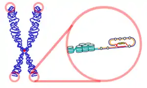 Telomerii sunt alcătuiți din cateva mii de repetiții ale unei secvențe scurte de ADN (la om având o lungime de 3 până la 20 kilobaze, plus încă 100-300 kilobaze asociate telomerului care sunt situate între telomer și restul cromozomului). Structura exactă a telomerilor nu este cunoscută, depinzând de secvențele de baze. La vertebrate, inclusiv omul, secvența repetată este TTAGGG, la insecte este TTAGG, iar la plante este TTTAGGG. În timpul interfazei, telomerii sunt cele mai îndepărtate zone ale cromozomilor de centrul nucleului. Deoarece ADN-polimeraza este incapabilă să copie capetele ADN-ului din cromozomi, are loc o permanentă scurtare a telomerilor odată cu fiecare replicare celulară, pierzându-se aproximativ 30-200 repetiții din telomer la fiecare ciclu.