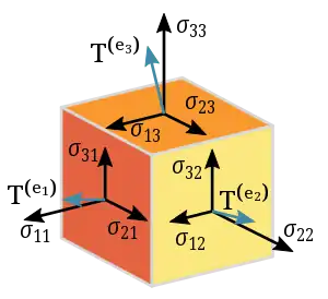 Dacă un element special de suprafață interiorul materialului este separat, materialul de pe o parte a suprafeței va aplica o forță asupra celeilalte părți. În general, această forță nu va fi ortogonală pe suprafață, dar va depinde de orientarea suprafeței într-o manieră liniară. Aceasta este descrisă de un tensor de tip (2, 0), în elasticitatea liniară(d) sau, mai precis, de un câmp tensorial de tip (2, 0), deoarece tensiunile pot varia de la un punct la altul.