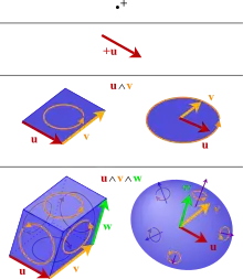 m 0 1 2 3 ⋯ M ⋯ n 0 Scalar, de ex. curbura scalară formă liniară(d), funcțională liniară(d), 1-formă(d), de ex. momentul dipol(d), gradientul unui câmp scalar Forme biliniare, de ex. produsul scalar, momentul cvadripol(d), tensorul metric(d), curbura Ricci, 2-formele(d), formele simplectice 3-form E.g. momentul octupol(d) De ex. M-forme adică forme de volum(d) 1 Vectorul euclidian Transformare liniară,[11] delta Kronecker(d) E.g. produsul vectorial în trei dimensiuni E.g. tensorul de curbură Riemann 2 Tensorul metric(d) invers, bivectorii(d), de exemplu structura Poisson(d) De ex. tensorul elasticitate ⋮ N Multivectorii(d) ⋮