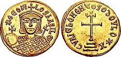 Monedă cu împăratul Theophil împreună cu însemnele imperiale