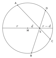 unde r este raza cercului, iar d este distanța dintre centrul cercului și punctul de intersecție, S. Această proprietate decurge direct din aplicarea teoremei coardelor la o a treia coardă, care trece prin S și centrul cercului M (v. figura de alături).