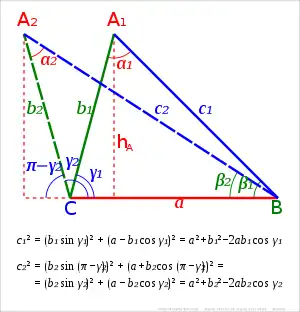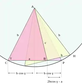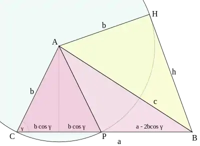 Perpendiculara din A pe a = BC, crează un segment de lungime b cos γ. Prin duplicarea triunghiului dreptunghic se formează un triunghi isoscel ACP. Construind cercul cu centru A și rază b și o coardă prin B perpendiculară la c = AB, jumătatea căreia e h = BH prin teorema lui Pitagora se obține: