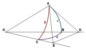 Fie triunghiul sferic ABC, O fiind centrul sferei de rază egală cu 1. Tangenta din punctul A la arcul AC întâlnește pe OC în E, iar tangenta din A la arcul AB întâlnește pe OB în D. Din această construcție rezultă că unghiul EAD este egal cu unghiul A din triunghiul sferic. De asemenea unghiul EOD dă măsura laturii a. Triunghiurile ADE și OED sunt plane și aplicând teorema lui Pitagora generalizată obținem: