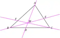 Teorema lui Ceva - Fie triunghiul ABC și D, E, F trei puncte diferite de vârfurile triunghiului aflate respectiv pe laturile acestuia [BC], [CA], [AB]. Atunci dreptele AD, BE și CF sunt concurente dacă și numai dacă: